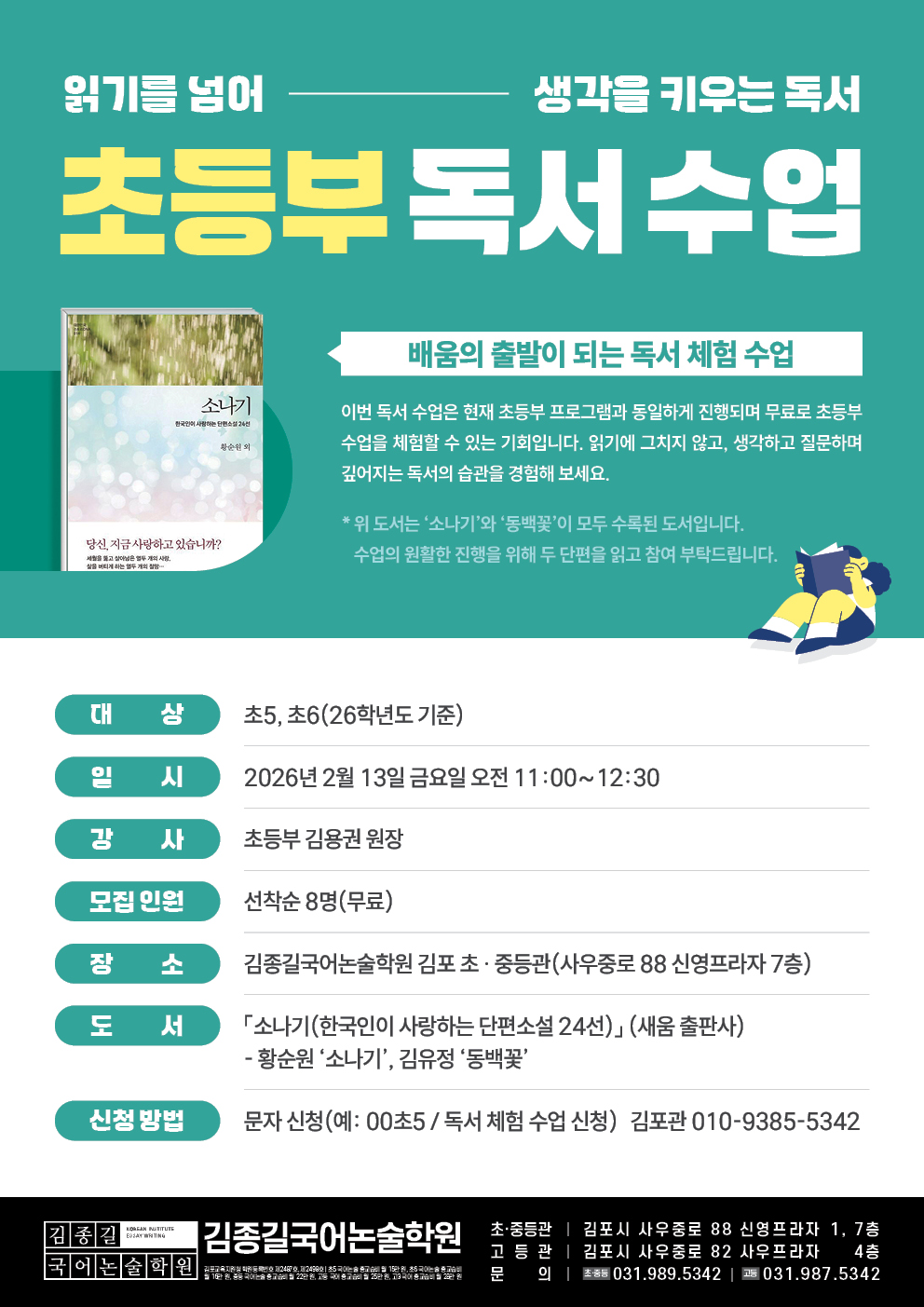 신청 방법: 문자 신청(예: 00초5 / 독서 체험수업 신청) 김포관 010-9385-5342