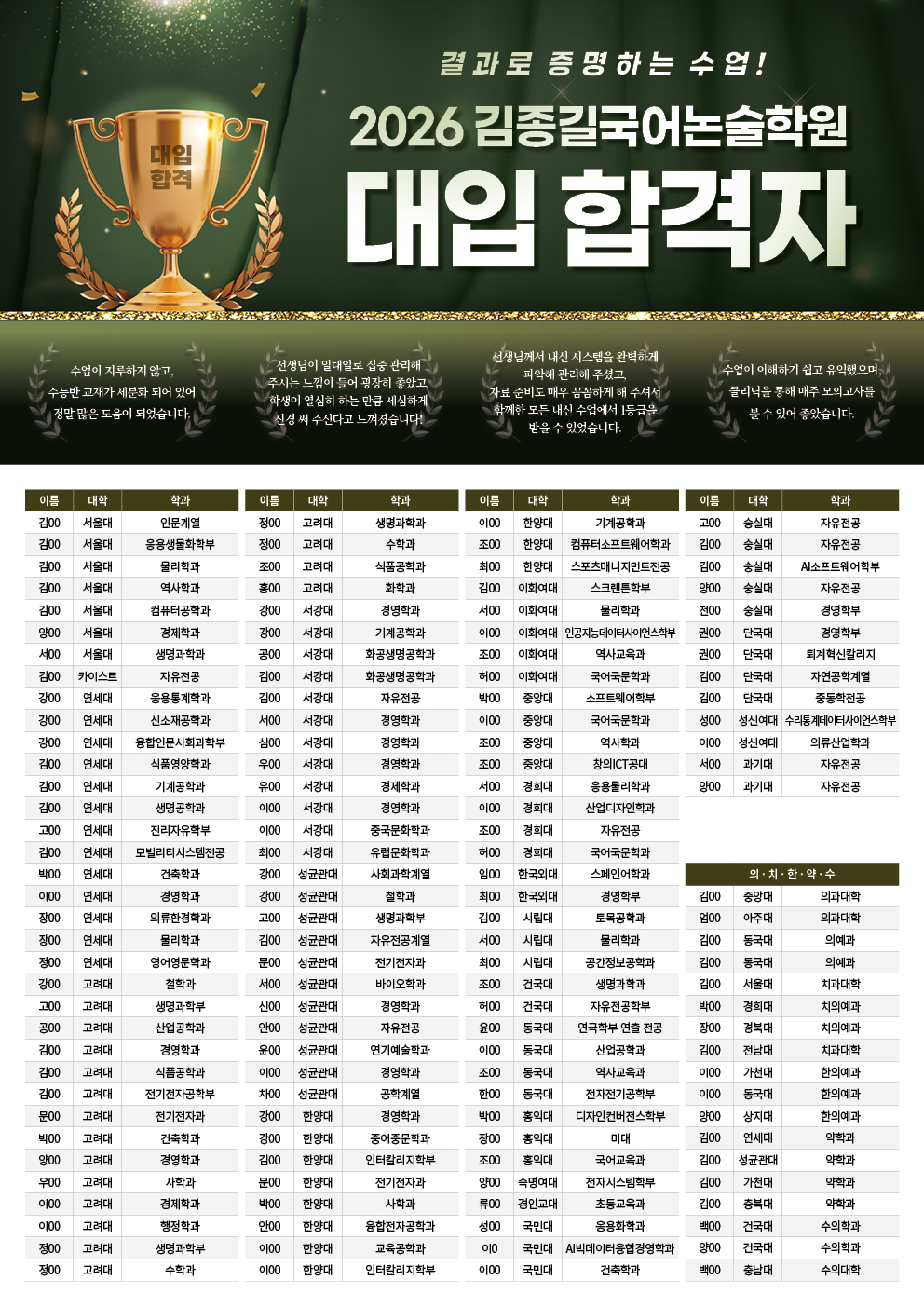 2026학년도 김종길국어논술학원 대입 합격자 소식
