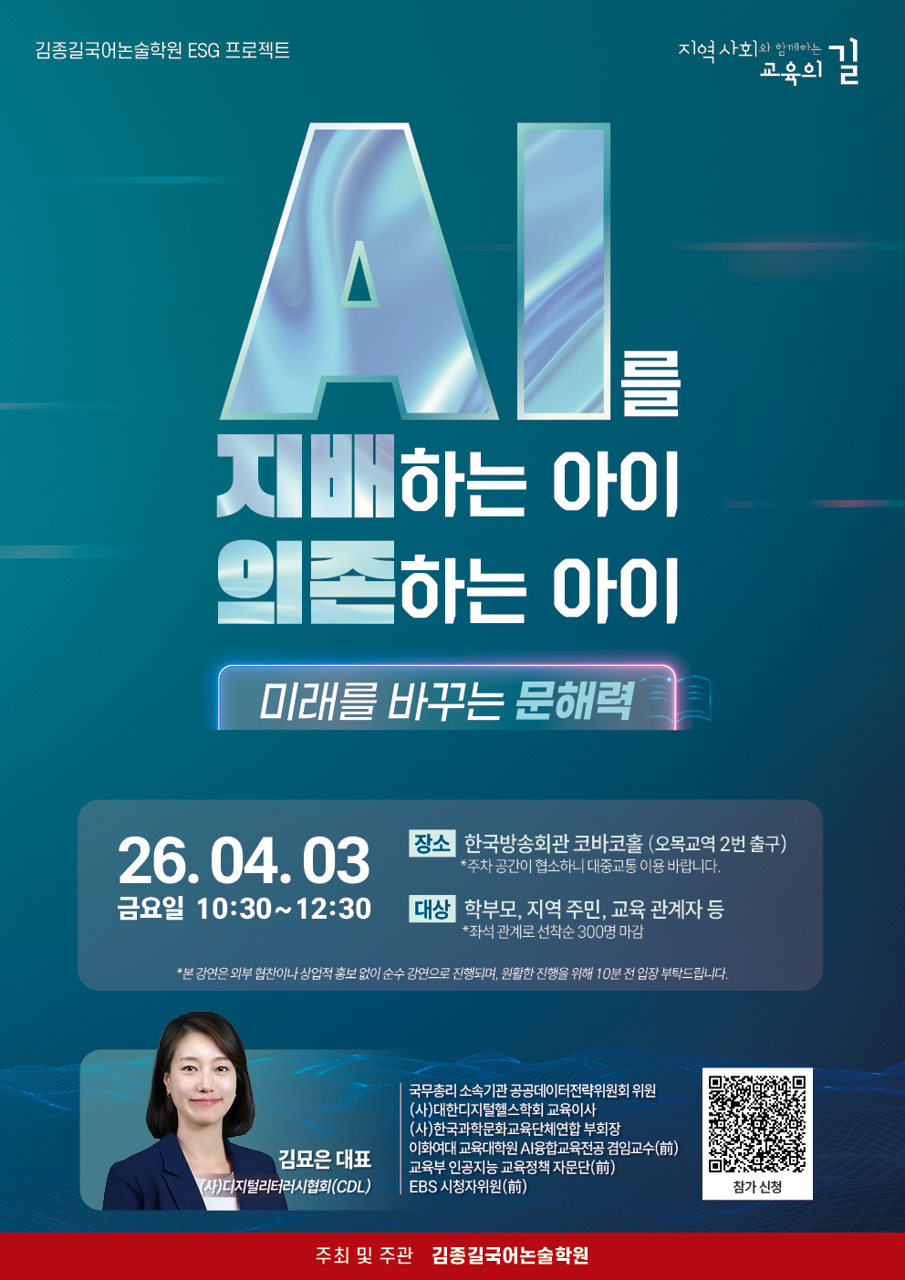 [초청 강연 안내] "AI를 지배하는 아이, AI에 의존하는 아이: 미래를 바꾸는 문해력"
