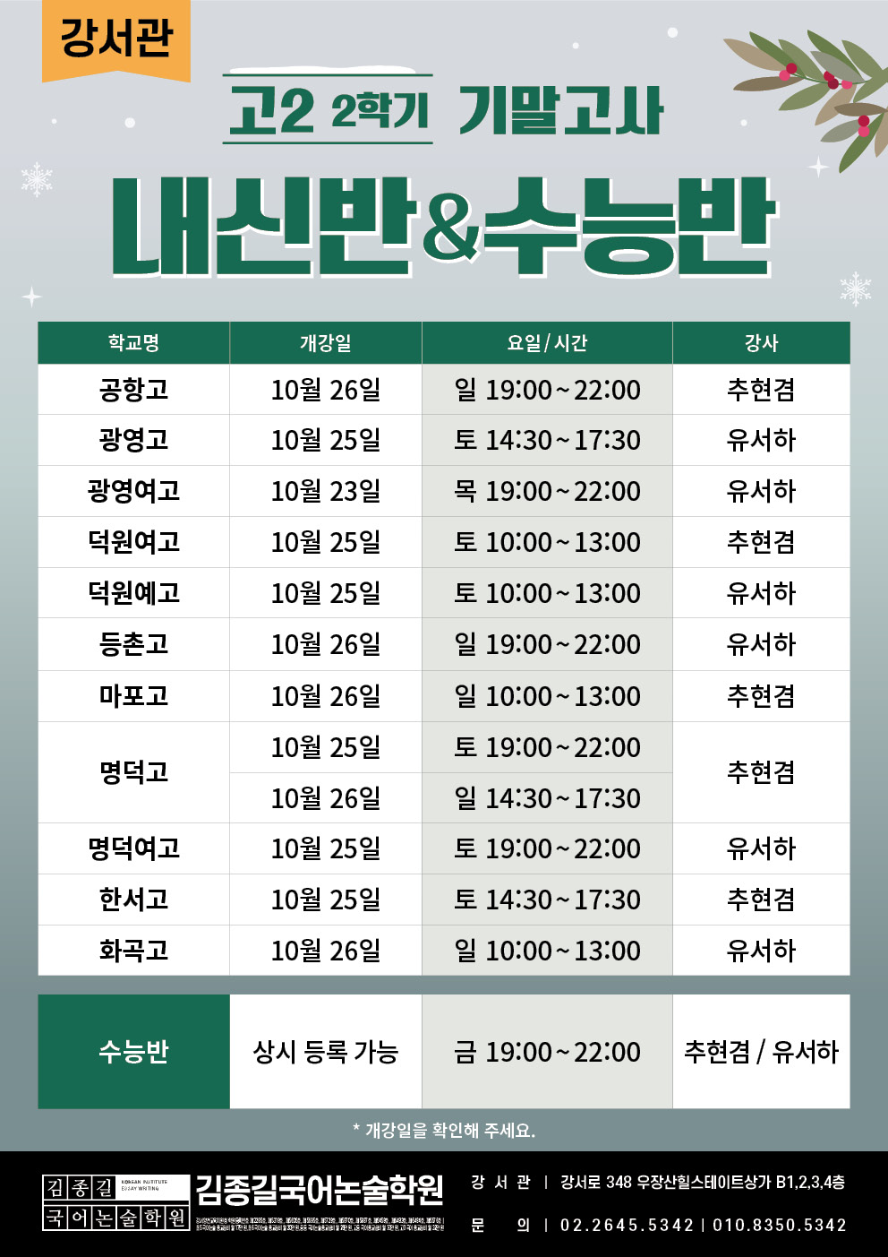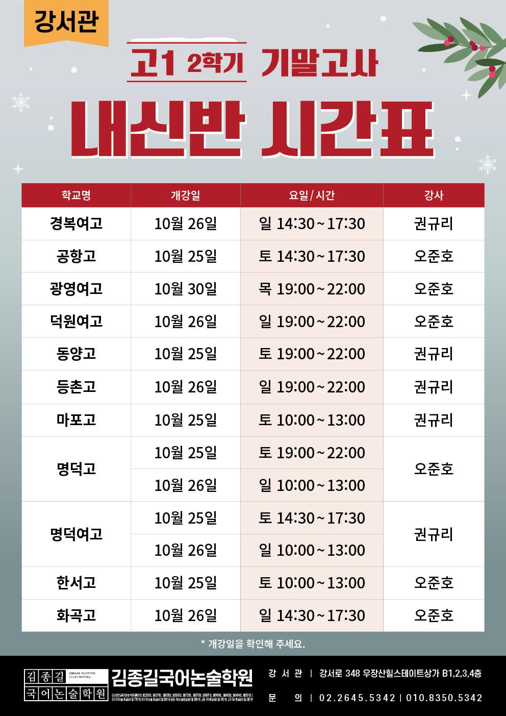 [강서관] 고등 2학기 기말고사 내신 시간표