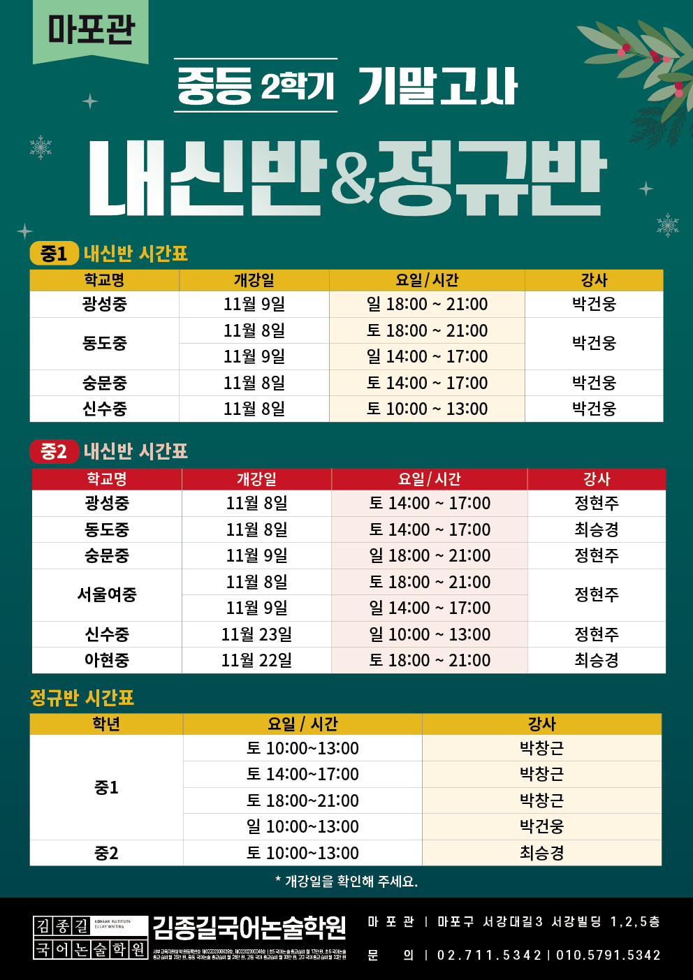 [마포관] 중등 2학기 기말고사 내신 시간표
