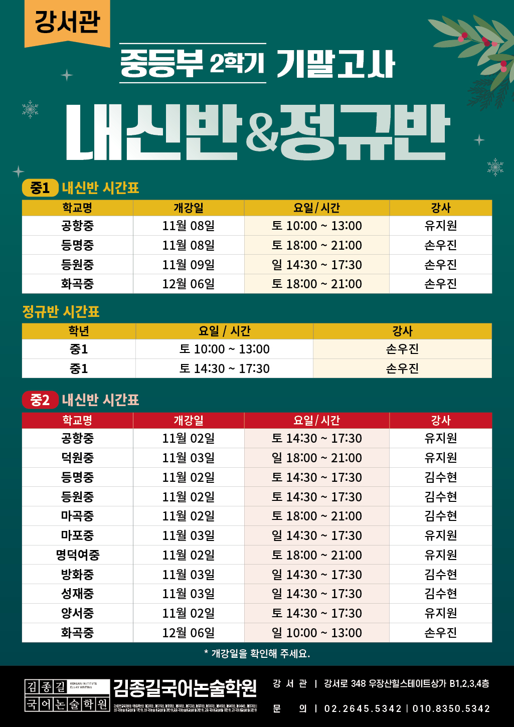 [강서관] 중등 2학기 기말고사 내신 시간표