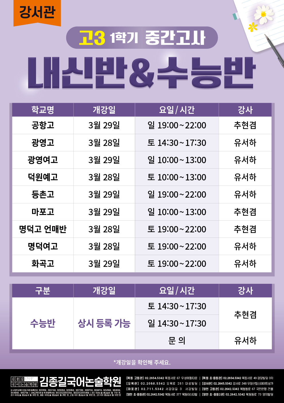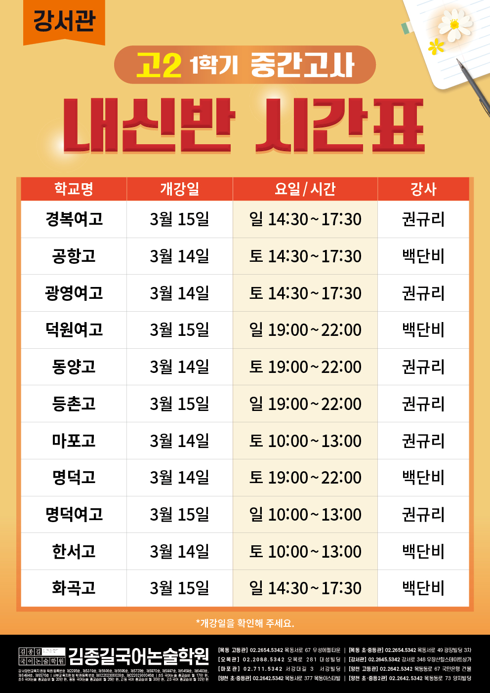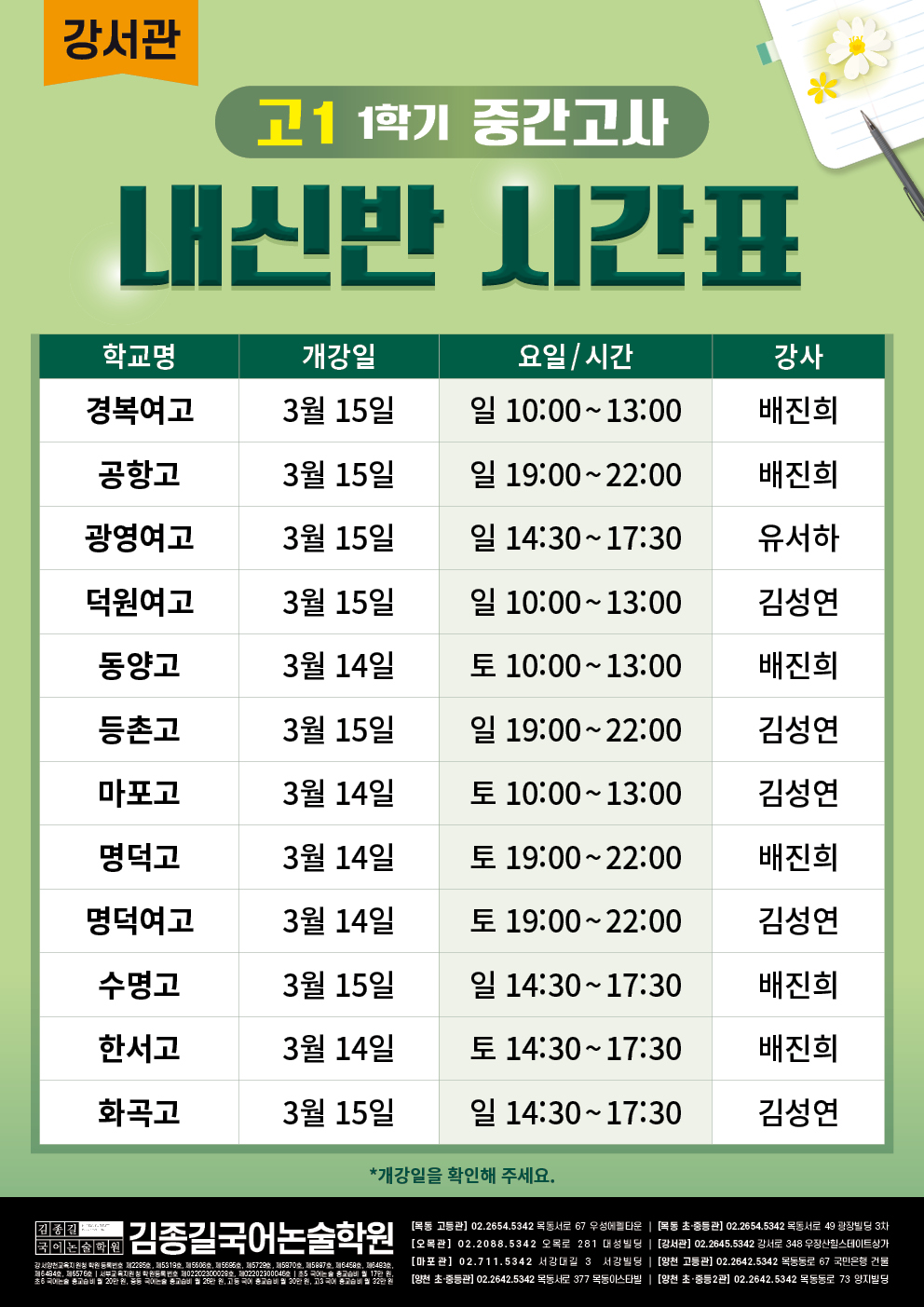 [강서관] 고등 1학기 중간고사 내신반 시간표