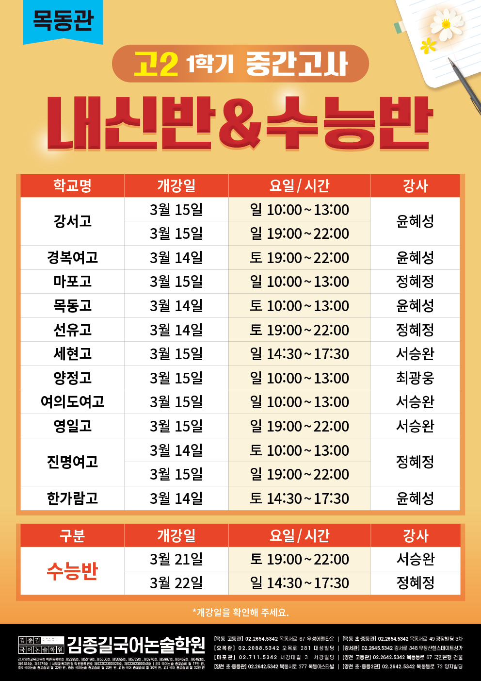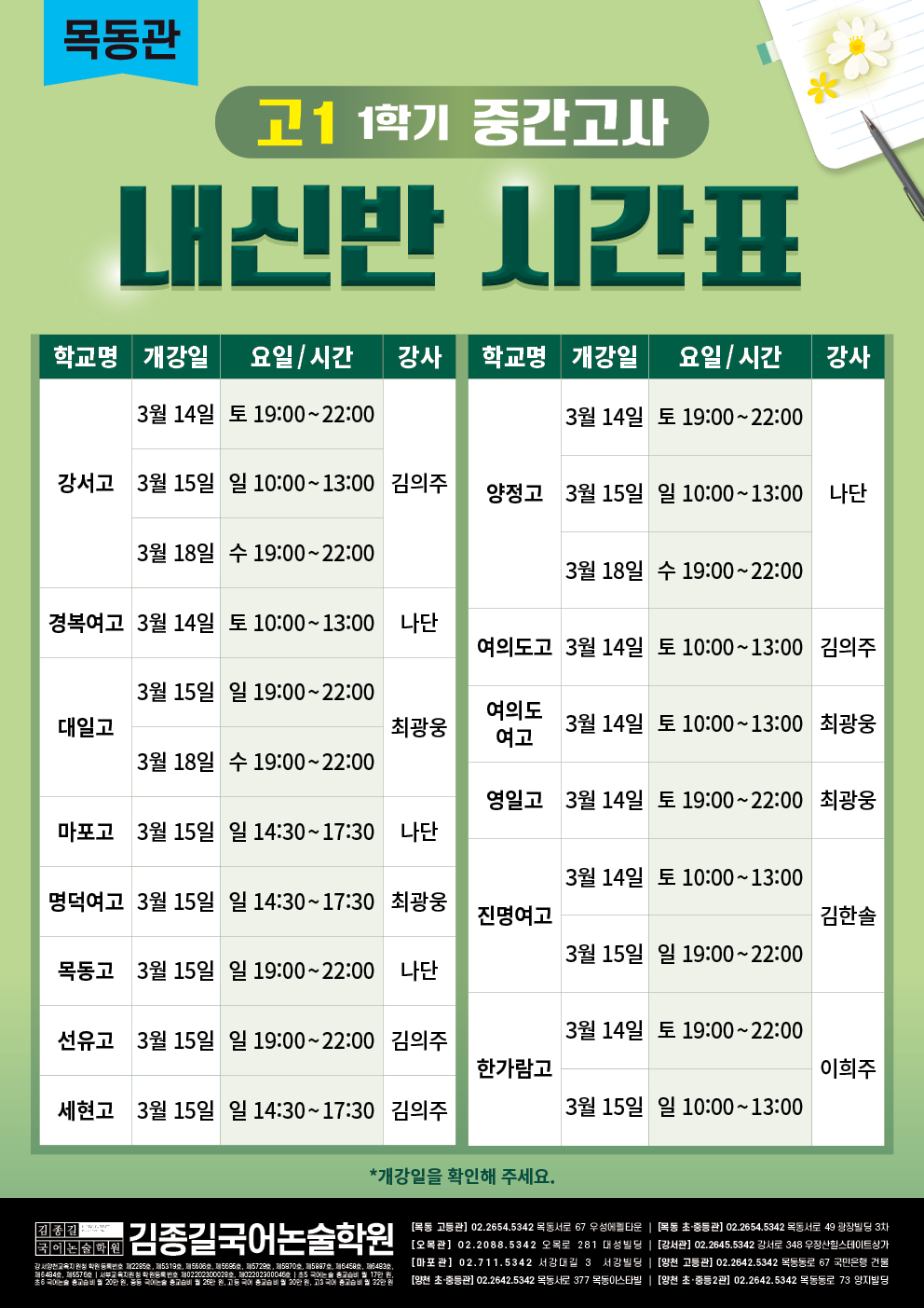[목동관] 고등 1학기 중간고사 내신반 시간표