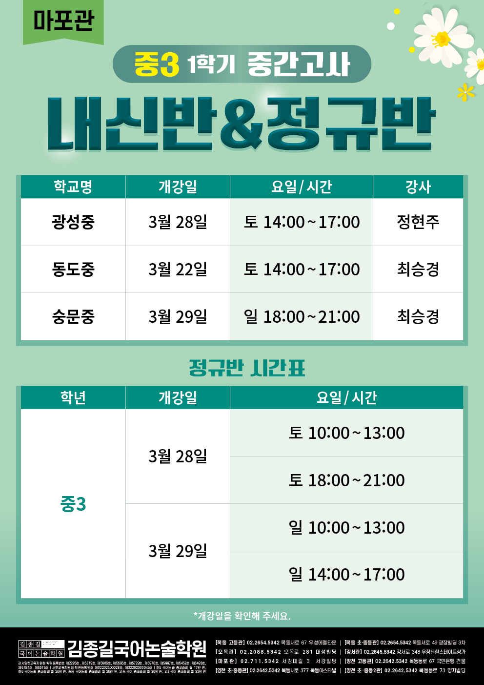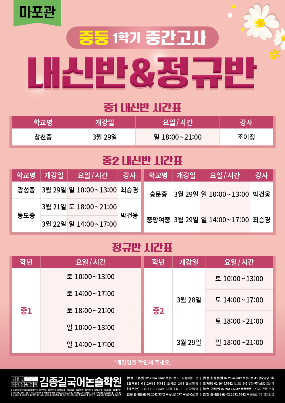 [마포관] 중등 1학기 중간고사 내신반&정규반 시간표
