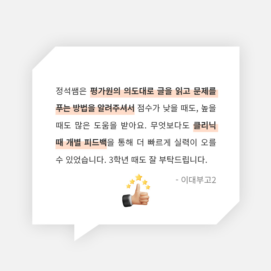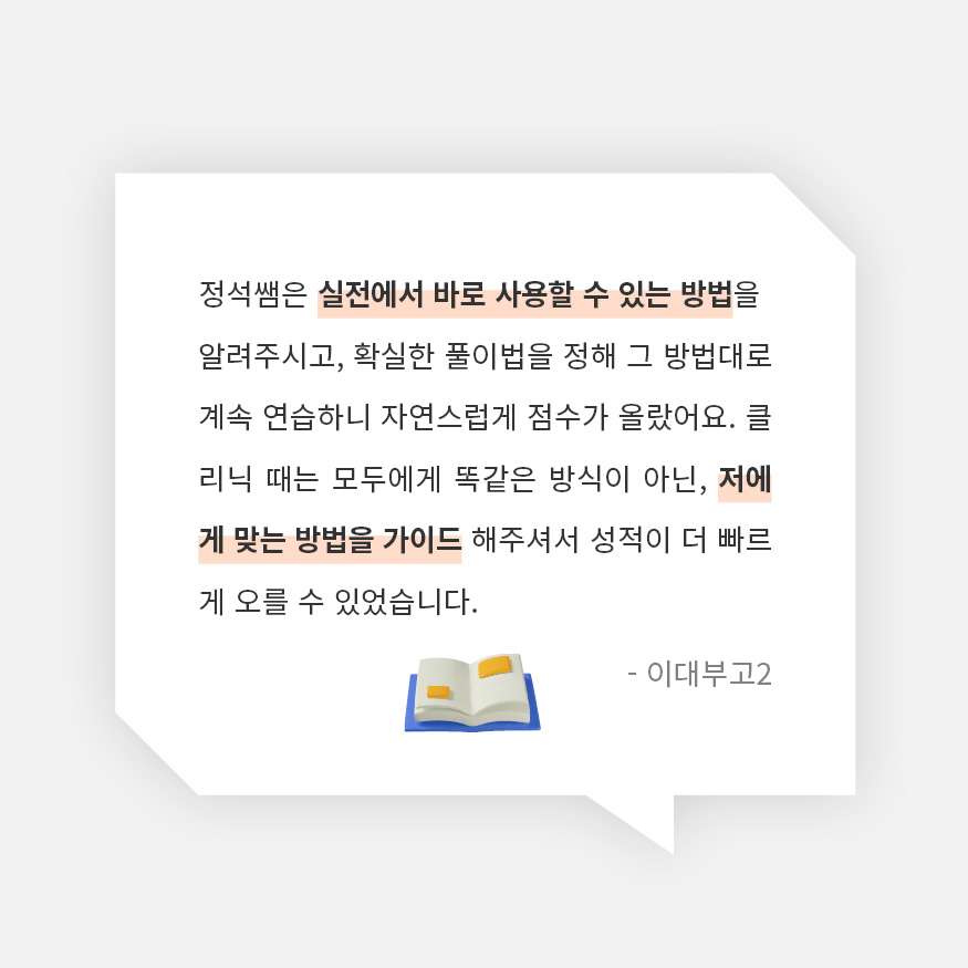 • 교육청 모의고사 및 사설 모의고사 풀이 • 아침 모의고사를 통한 실전 감각 완성 • 개별 밀착 클리닉을 통한 맞춤 피드백 |